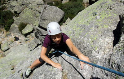 Juan se mete en La Pedrá (6a) a la derecha del sector. Nosotros optamos por una vía larga a la izquierda que recorre una placa vertical con agarres, Me gusta hacerlo lentamente (V).